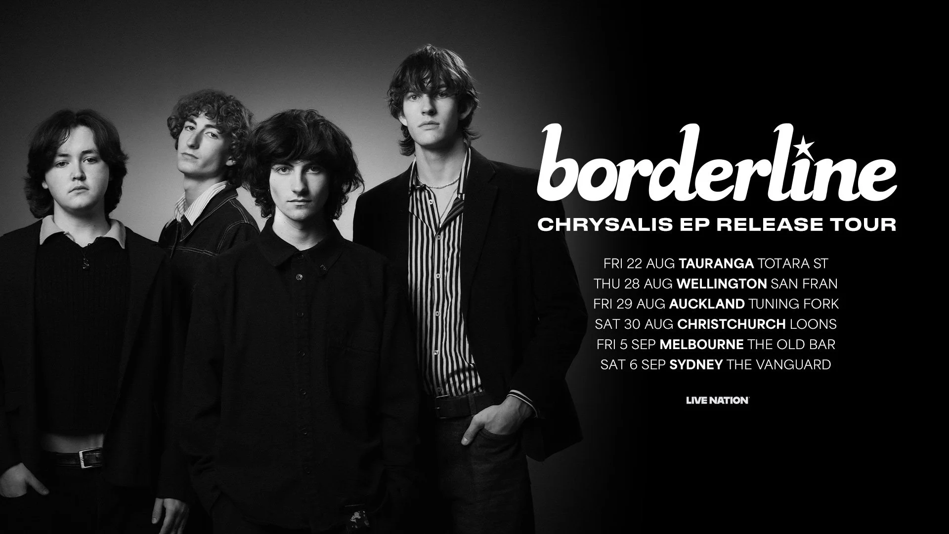 Rapidly rising indie-pop outfit Borderline have today announced a variety of New Zealand and Australia dates for their 6-stop Chrysalis EP Release Tour. Throughout August and September, Borderline will be heading across New Zealand - to Te Awanui Tauranga, Pōneke Wellington, Tāmaki Makaurau Auckland and Ōtahutahi Christchurch - as well as two Australian dates in Melbourne and Sydney.