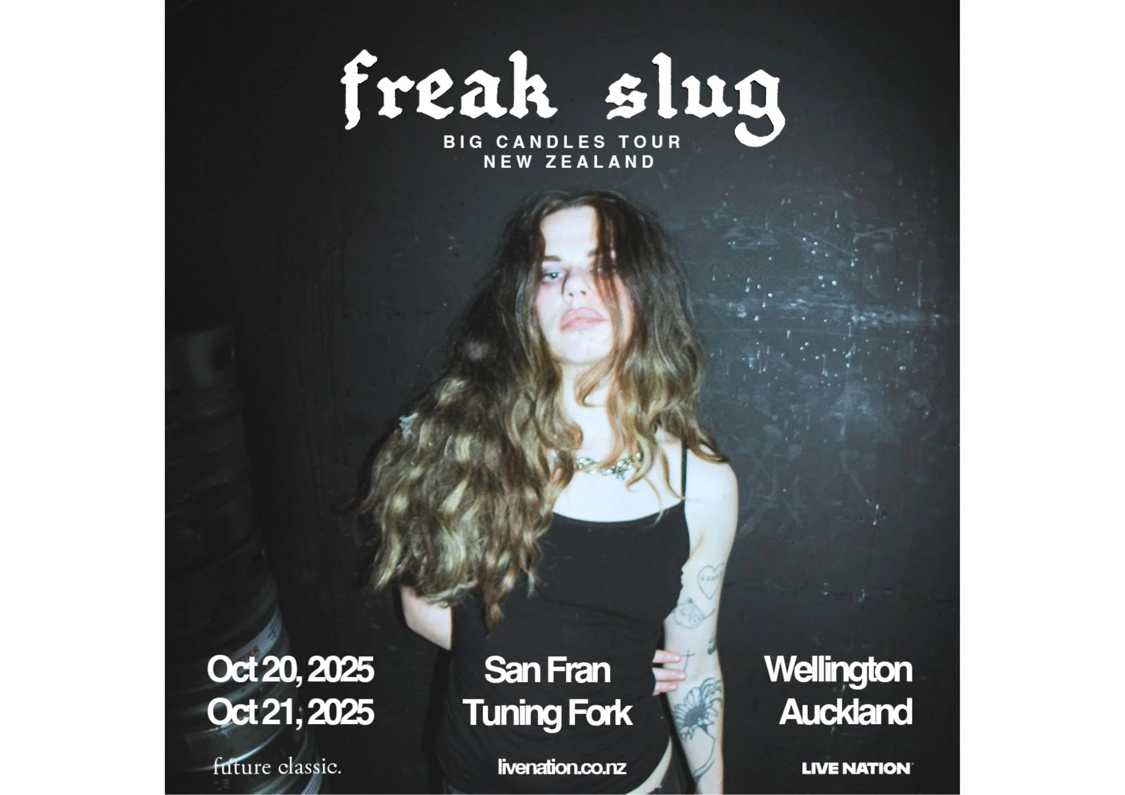 Hugely influenced by ‘90s cult heroes including Ride, Mazzy Star and Stephen Malkmus, Freak Slug is all about hitting a mood. Everything that fuels her creative output is raw, authentic, sometimes weird, but always totally true self-expression. I Blow Out Big Candles is a strong statement of all of this and more. Down there, picking through the curious mix of sounds and feelings, from nostalgic, ‘90s-influenced and dreamy as well as eccentric and experimental, lives Freak Slug. The 10-track project gives listeners a taste of what they will be in for at her Aotearoa shows, a journey of both soft soulfulness and sonic songwriting, all laid out on the table.