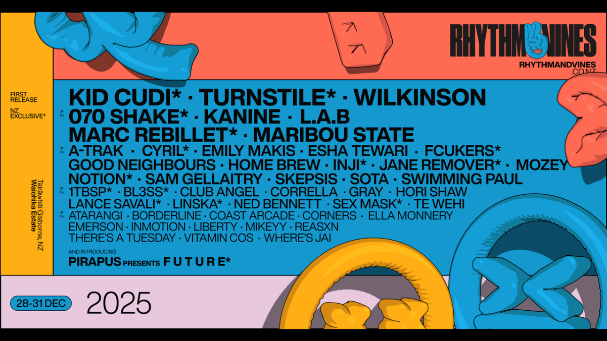 Kiwis on the pursuit of happiness would have found it today with the announcement of Brooklyn rapper KID CUDI headlining the 23rd edition of Rhythm and Vines. Along with 48 other acts announced on the first lineup release, the first release features first ever Hardcore punk headliners for the festival in TURNSTILE, American rapper 070 SHAKE, youtube star and electronic producer MARC REBILLET, live set from UK electronic music duo MARIBOU STATE, and the return of fan favourites L.A.B. Drum and Bass producer WILKINSON, the king of Waiohika Estate, will be headlining New Year’s Eve and bringing festival fans into 2026.